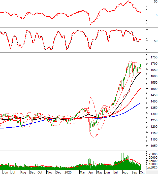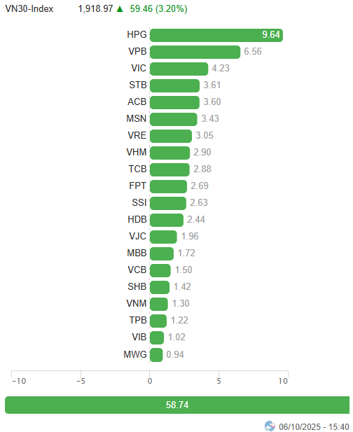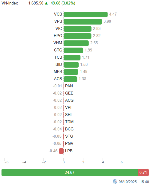 – Thị trường chứng khoán Việt Nam bùng nổ mạnh mẽ trong phiên giao dịch ngày 06/10. Sau nhịp rung lắc nhẹ đầu phiên, lực cầu nhanh chóng chiếm ưu thế, đặc biệt ở nhóm cổ phiếu vốn hóa lớn, giúp VN-Index tăng tốc và duy trì sắc xanh vững vàng trong suốt phiên sáng. Sang đến phiên chiều, dòng tiền lan tỏa rộng hơn, đẩy chỉ số tăng mạnh về cuối phiên với nhiều cổ phiếu trụ nới rộng biên độ. Kết phiên, VN-Index tăng gần 50 điểm, đóng cửa tại 1,695.5 điểm.