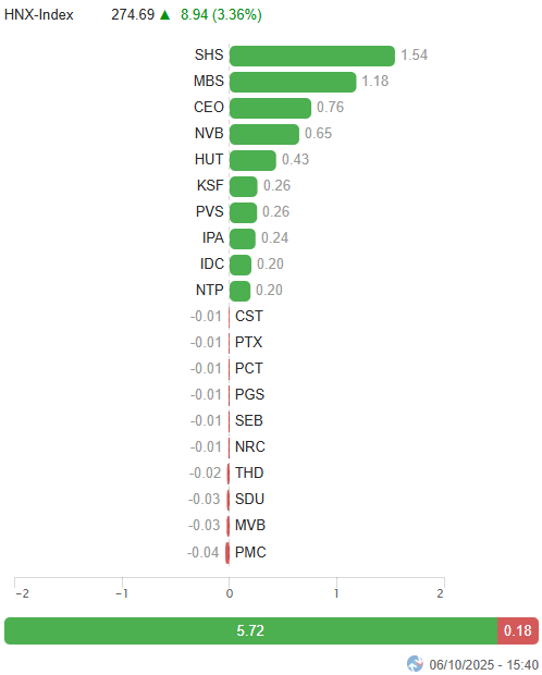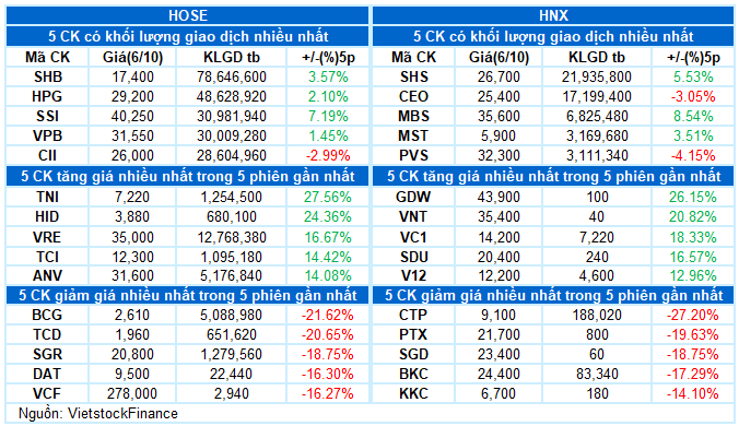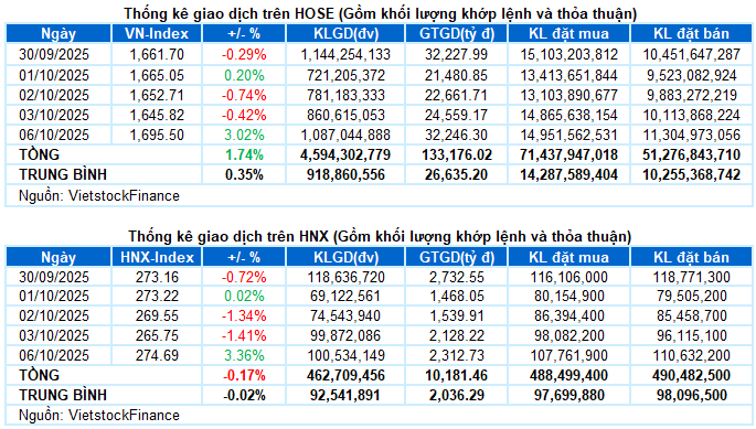 – Các chỉ số chính đồng loạt bật tăng mạnh mẽ trong phiên giao dịch ngày 06/10. Cụ thể, chỉ số VN-Index đạt 1,695.5 điểm, tăng mạnh 3.02%; HNX-Index cũng tăng đến 3.36%, kết phiên tại mức 274.69 điểm.