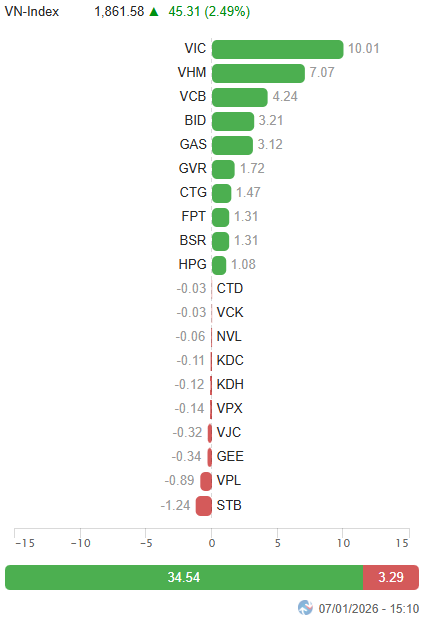 – Thị trường duy trì đà tăng tích cực trong phiên giao dịch 07/01 khi tâm lý nhà đầu tư được cải thiện rõ rệt sau cú bứt phá qua ngưỡng 1,800 điểm ở phiên trước. Sự hưng phấn lan tỏa nhanh chóng đã kích hoạt dòng tiền nhập cuộc chủ động hơn, không chỉ tập trung ở một vài cổ phiếu trụ mà còn mở rộng sang nhiều nhóm ngành. Nhờ sự đồng thuận ngày càng rõ nét của dòng tiền, VN-Index liên tục nới rộng đà tăng trong suốt phiên và đóng cửa với mức tăng hơn 45 điểm, lên mức 1,861.58 điểm.