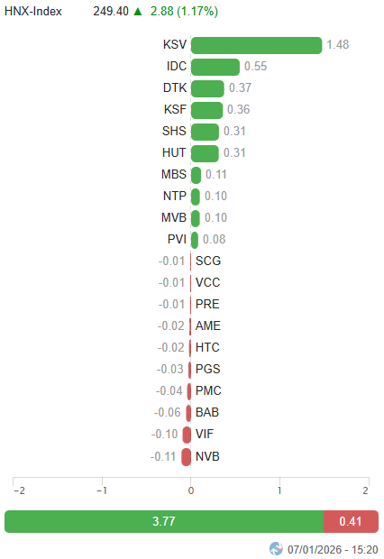 – Các chỉ số chính đồng loạt tăng mạnh trong phiên giao dịch ngày 07/01. VN-Index tăng 2.49%, lên mức 1,861.58 điểm; HNX-Index cũng chấm dứt chuỗi giảm với mức tăng 1.17%, đạt 249.4 điểm.