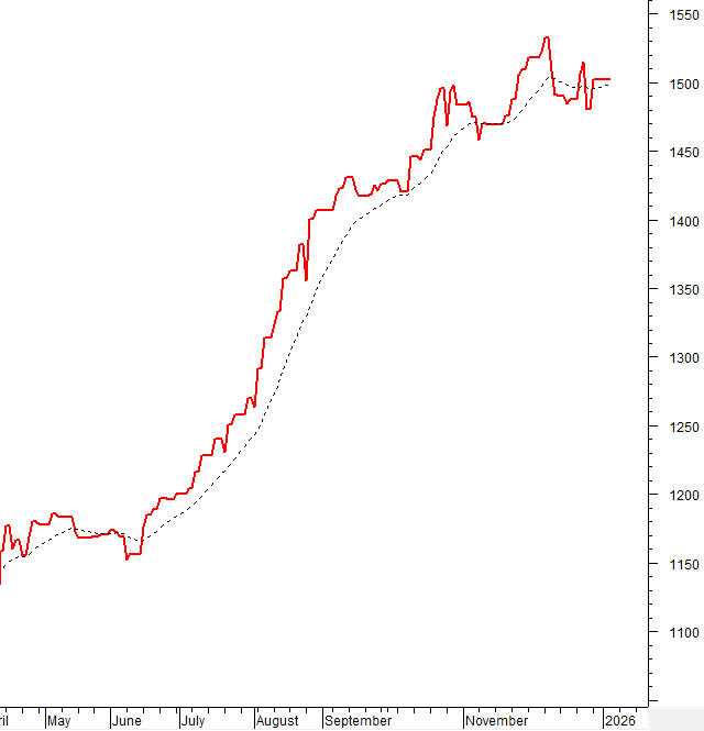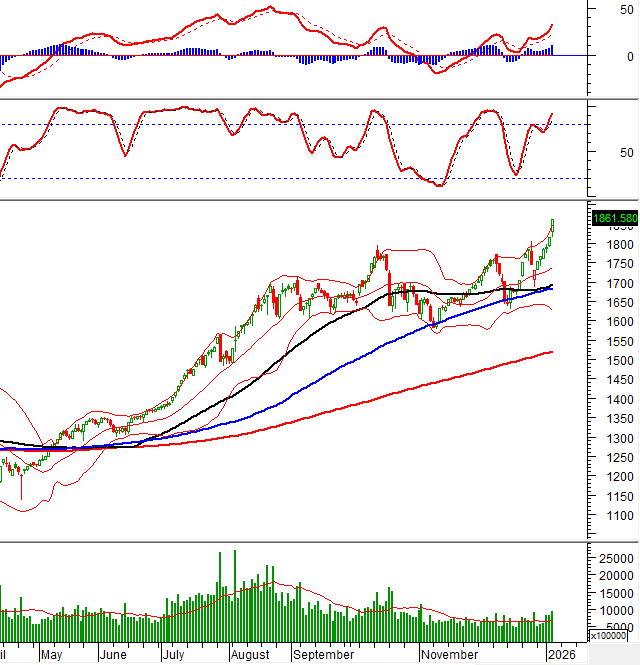 VN-Index duy trì đà tăng mạnh, thiết lập đỉnh cao mới đồng thời bám sát Upper Band của Bollinger Bands. Khối lượng giao dịch tiếp tục cải thiện và nằm trên mức trung bình 20 ngày cho thấy tâm lý lạc quan của nhà đầu tư.