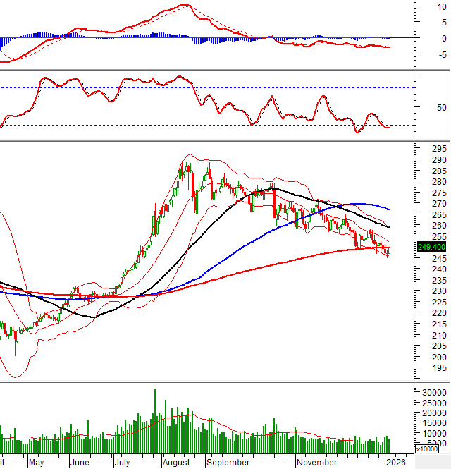 VN-Index duy trì đà tăng mạnh, thiết lập đỉnh cao mới đồng thời bám sát Upper Band của Bollinger Bands. Khối lượng giao dịch tiếp tục cải thiện và nằm trên mức trung bình 20 ngày cho thấy tâm lý lạc quan của nhà đầu tư. Chỉ báo MACD liên tục nới rộng khoảng cách với đường Signal, qua đó củng cố thêm cho triển vọng tích cực trong ngắn hạn.