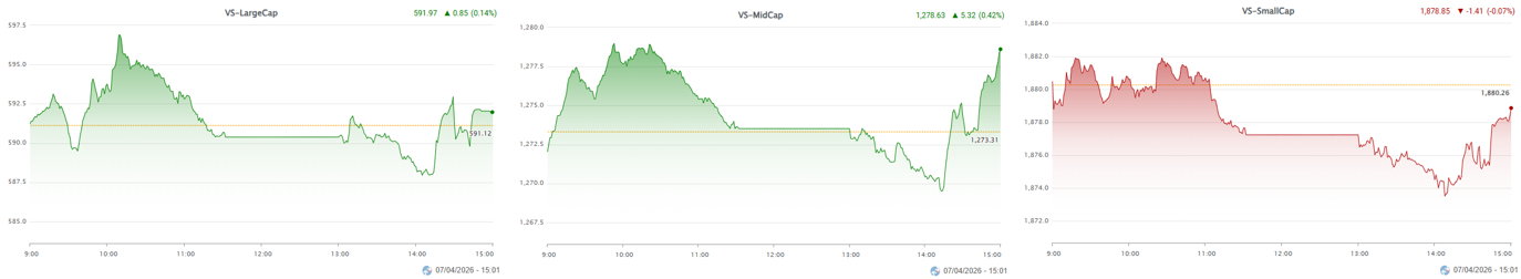 – Xét theo nhóm vốn hóa, VS-MidCap ghi nhận mức hồi phục tốt nhất sau phiên giảm mạnh trước đó, trong khi VS-LargeCap và VS-SmallCap dừng sát mốc tham chiếu với trạng thái phân hóa rõ nét.