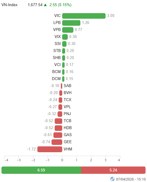 – Về mức độ ảnh hưởng, VIC có đóng góp tích cực nhất khi mang về 3 điểm cho VN-Index. Theo sau là LPB và VPB cũng đóng góp thêm tổng cộng 2 điểm tăng. Trong khi đó, VHM gây áp lực lớn nhất ở phía ngược lại, lấy đi 1.72 điểm của chỉ số chung.