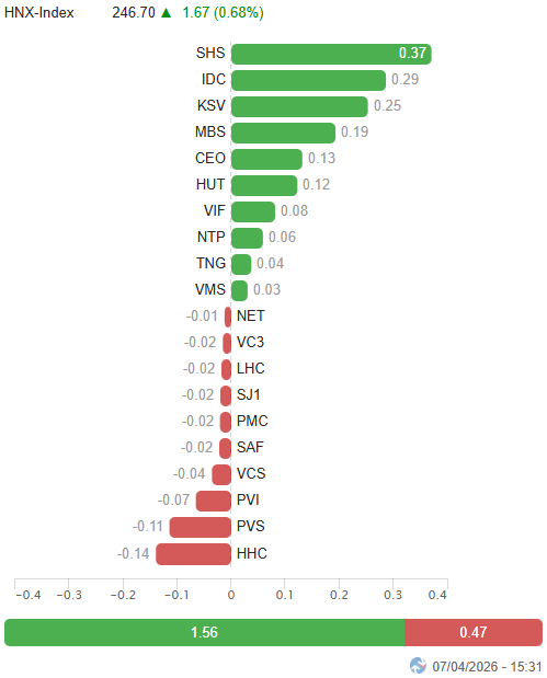 – Các chỉ số chính chững lại đà giảm trong phiên giao dịch ngày 07/04. VN-Index nhích nhẹ 0.15%, lên mức 1,677.54 điểm. HNX-Index tăng 0.68%, đạt 246.7 điểm.