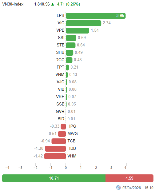 – VN30-Index tăng 4.71 điểm (+0.26%), lên mức 1,840.96 điểm. Độ rộng rổ khá cân bằng với 15 mã tăng, 13 mã giảm và 2 mã đứng giá. Ở phía tích cực, LPB dẫn đầu với mức tăng vượt trội 4.1%, tiếp theo là DGC và SSI cũng thu hút lực cầu tốt khi tăng hơn 2%. Trái lại, HDB, VHM, GAS và TCB vẫn bị áp lực bán chi phối đáng kể với mức giảm trên 1%.