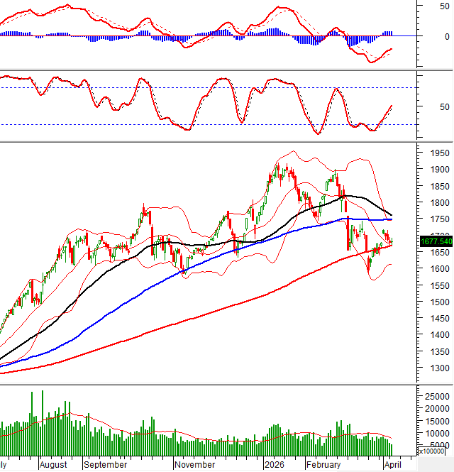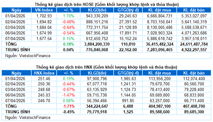 – Thị trường giao dịch ảm đạm khi thanh khoản tiếp tục dò đáy trong phiên 07/04. VN-Index mở cửa với nỗ lực hồi phục và nhanh chóng tiến lên vùng 1,690 điểm, nhưng động lực không đủ duy trì khi lực cầu chủ yếu mang tính thăm dò. Trong bối cảnh dòng tiền hạn chế, chỉ số nhanh chóng suy yếu và quay về dưới mốc tham chiếu từ cuối phiên sáng. Đà giảm tiếp tục mở rộng sang phiên chiều trước khi lực kéo cuối phiên giúp chỉ số phục hồi và lấy lại sắc xanh nhẹ. VN-Index đóng cửa tại 1,677.54 điểm, tăng 0.15% so với phiên trước.