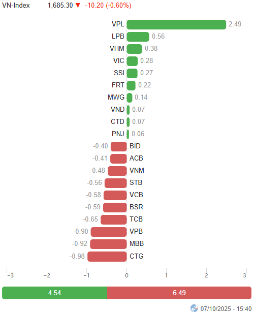 – Thị trường trở lại trạng thái thận trọng sau phiên hưng phấn hôm qua, khi nhà đầu tư đang nóng lòng chờ đợi kết quả xem xét nâng hạng từ FTSE Russell sẽ được công bố vào rạng sáng mai (theo giờ Việt Nam). Phiên giao dịch 07/10, VN-Index mở cửa vượt mốc 1,700 điểm nhưng nhanh chóng suy yếu ngay sau đó. Dù lực cung không quá mạnh nhưng cầu cũng trở nên dè dặt hơn hẳn, chỉ số giằng co quanh mốc tham chiếu đến hết phiên sáng. Sắc thái ảm đạm kéo dài sang buổi chiều khi thanh khoản không có sự cải thiện. VN-Index dần trượt dốc và kết phiên ở ngưỡng 1,685.3 điểm, giảm 0.6% so với phiên trước.