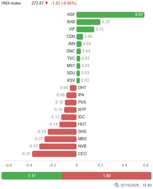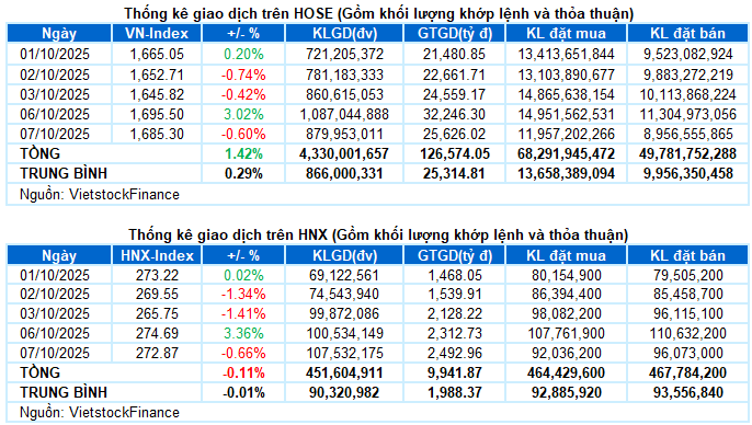 – Các chỉ số chính đồng loạt điều chỉnh trong phiên giao dịch ngày 07/10. Cụ thể, VN-Index giảm 0.6%, dừng tại 1,685.3 điểm; HNX-Index cũng mất 0.66%, xuống còn 272.87 điểm.