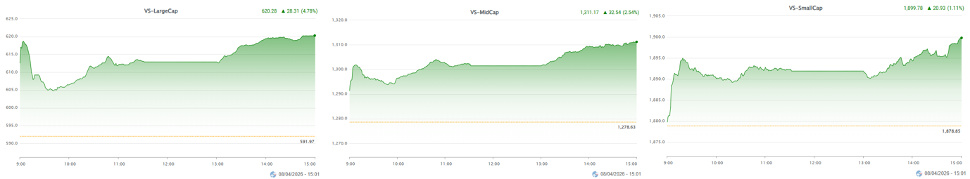 – Thị trường ghi nhận sự đồng thuận tăng điểm trên diện rộng, trong đó các cổ phiếu vốn hóa lớn đóng vai trò dẫn dắt chính. VS-LargeCap thu hút lực cầu mạnh nhất với mức tăng vượt trội 4.78%, VS-MidCap tăng 2.55% và VS-SmallCap tăng 1.11%.