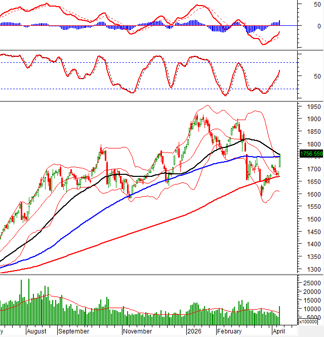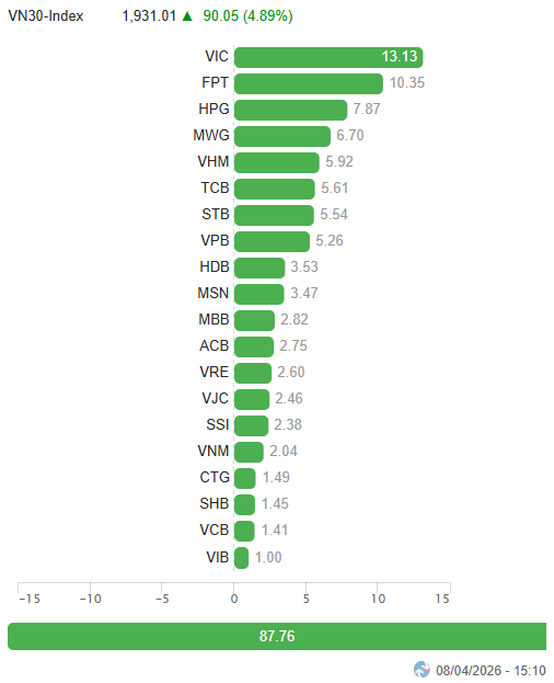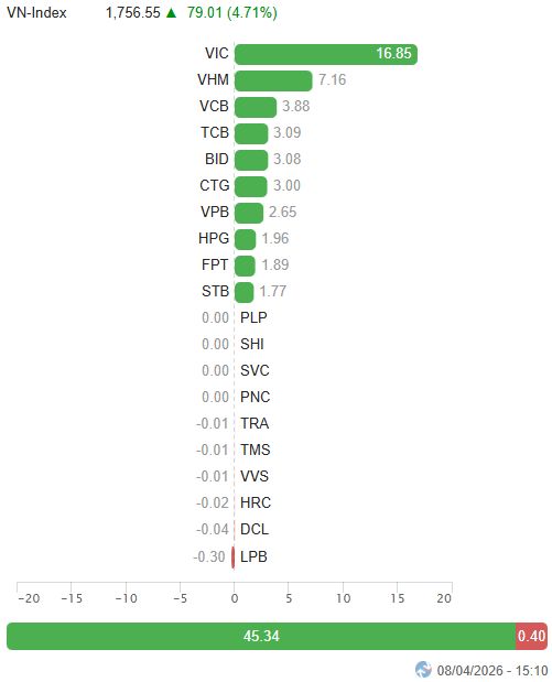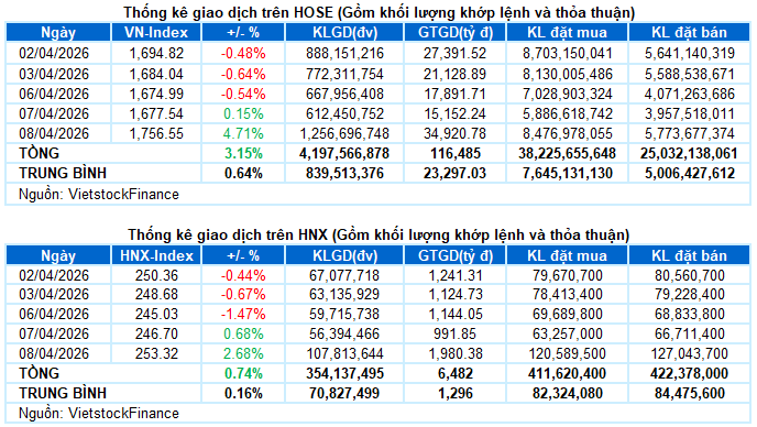 – Thị trường bùng nổ mạnh trong phiên giao dịch ngày 08/04 khi VN-Index mở cửa với gap tăng lớn và nhanh chóng bứt phá lên trên vùng 1,720 điểm, phản ánh sự đảo chiều rõ nét về tâm lý trong bối cảnh căng thẳng quốc tế hạ nhiệt cùng thông tin FTSE Russell xác nhận Việt Nam sẽ được nâng hạng lên thị trường mới nổi từ tháng 9/2026. Không chỉ dừng ở yếu tố hưng phấn, dòng tiền đã nhập cuộc một cách chủ động và lan tỏa rộng khắp giúp chỉ số duy trì mặt bằng giá cao dù áp lực chốt lời đáng kể xuất hiện sau nhịp tăng nóng đầu phiên. Bước sang phiên chiều, đà tăng tiếp tục được duy trì theo hướng đi lên ổn định giúp VN-Index đóng cửa ở mức cao nhất trong ngày tại 1,756.55 điểm.