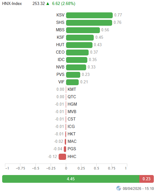 – Các chỉ số chính bứt phá mạnh trong phiên giao dịch ngày 08/04. VN-Index tăng mạnh 4.71%, lên mức 1,756.55 điểm. HNX-Index cũng tăng 2.68%, đạt 253.32 điểm.