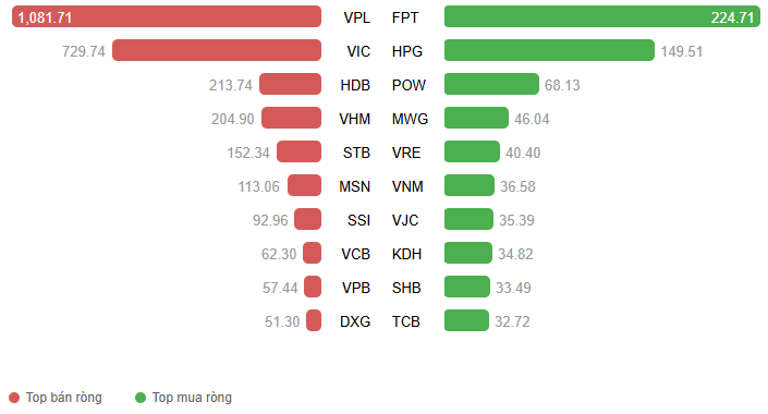 – Về mức độ ảnh hưởng, VHM là cổ phiếu gây áp lực lớn nhất khi lấy đi 2.46 điểm của VN-Index. Ngoài ra, VPB, LPB và VPL cũng kéo chỉ số giảm thêm 4.8 điểm. Còn ở chiều ngược lại, VIC tiếp tục là trụ cột nâng đỡ tích cực nhất với đóng góp lên đến hơn 7 điểm cho VN-Index.