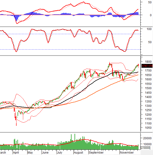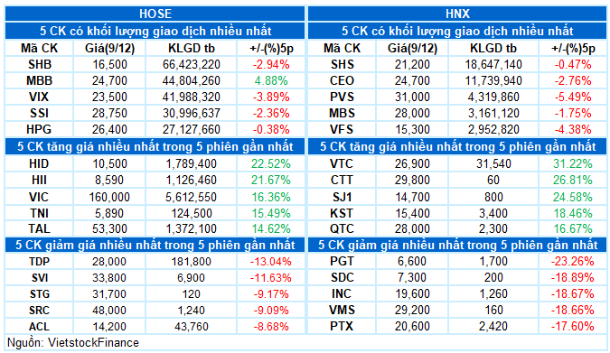 – Trong phiên giao dịch ngày 09/12, VN-Index chịu áp lực bán mạnh ngay từ đầu phiên khi tâm lý thận trọng bao trùm toàn thị trường, kéo chỉ số giảm liên tục đến hết phiên sáng. Bước sang phiên chiều, lực bán bất ngờ gia tăng khiến chỉ số có thời điểm thủng mốc 1,730 điểm. Tuy nhiên, dòng tiền bắt đáy nhập cuộc khá tốt giúp thị trường phục hồi trở lại, thu hẹp đáng kể mức giảm. Kết phiên, VN-Index đóng cửa tại 1,747.17 điểm, giảm 6.57 điểm so với phiên trước.