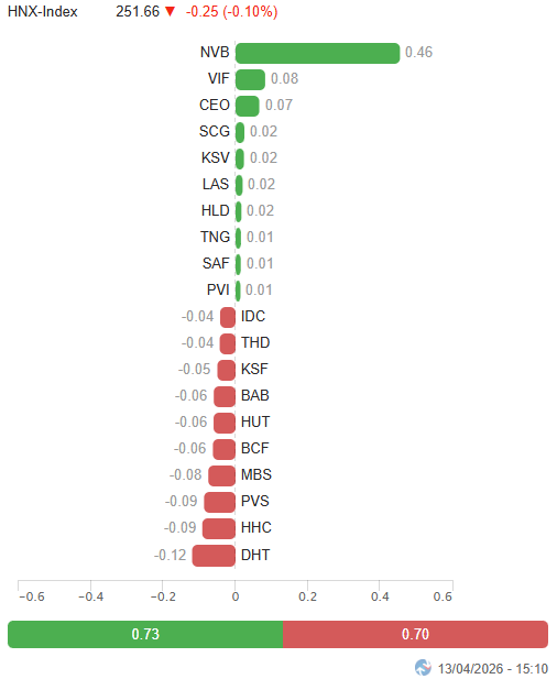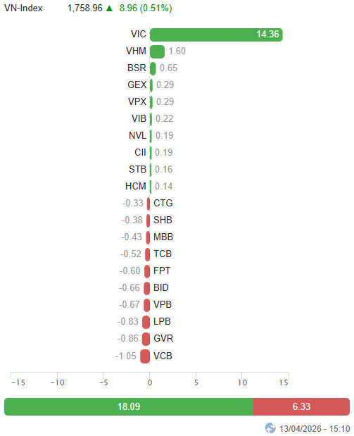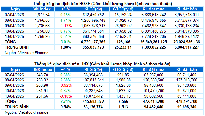 – Các chỉ số chính tăng giảm trái chiều trong phiên giao dịch ngày 13/04. VN-Index tăng 0.51%, lên mức 1,758.96 điểm. Trong khi đó, HNX-Index giảm nhẹ 0.1%, đạt 251.66 điểm.