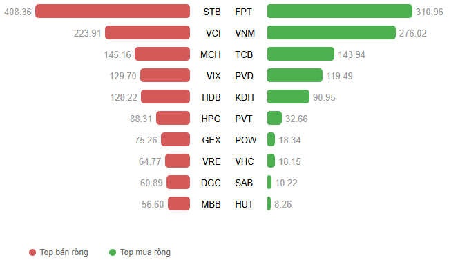 – Về mức độ ảnh hưởng, lực kéo và lực cản cân bằng khi 10 cổ phiếu đóng góp tích cực nhất mang về 5 điểm tăng cho VN-Index, trong khi 10 cổ phiếu tác động tiêu cực nhất cũng lấy đi số điểm tương đương. GEE, VNMDGC là những mã dẫn đầu ở phía tích cực, trong khi STB, HPGFPT cản trở đáng kể ở phía ngược lại.