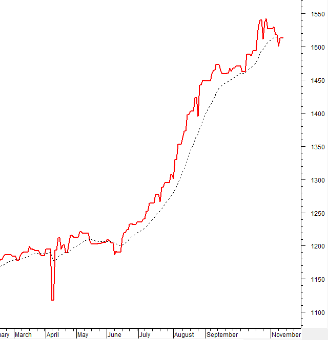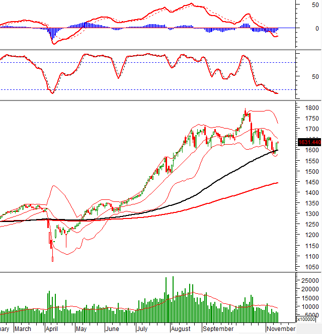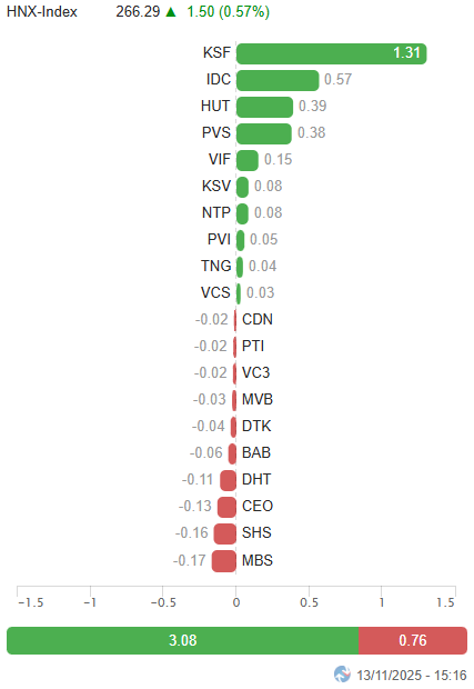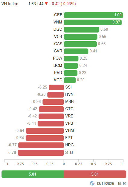 – Thị trường trở lại trạng thái phân hóa trong phiên giao dịch 13/11. VN-Index chủ yếu giằng co với biên độ hẹp trong phần lớn thời gian giao dịch. Áp lực điều chỉnh hiện diện ở nhóm cổ phiếu trụ khiến chỉ số khó bứt phá, nhưng lực cầu gia tăng tại các cổ phiếu vừa và nhỏ, đặc biệt là các nhóm năng lượng, hóa chất và phân bón, đã phần nào bù đắp khoảng trống do sự suy yếu của nhóm trụ tạo ra, giúp thị trường duy trì nhịp giao dịch khá cân bằng. Kết phiên, VN-Index đóng cửa ngay dưới mốc tham chiếu, đạt 1,631.44 điểm.