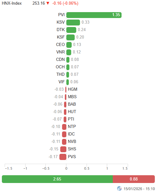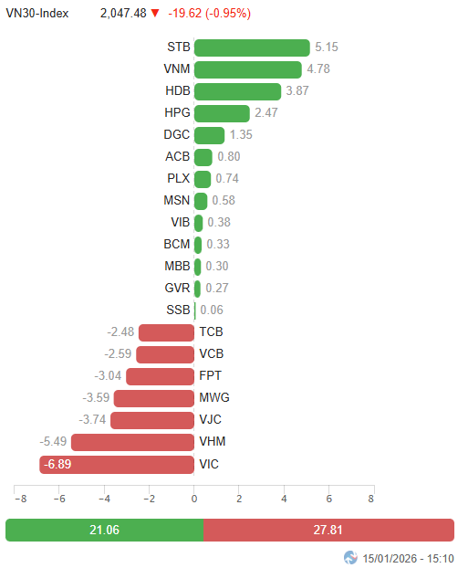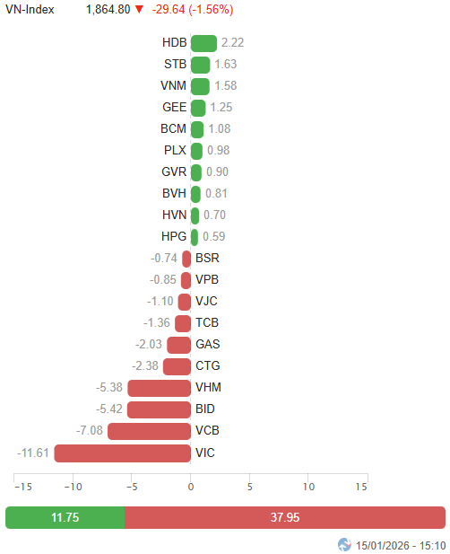 – Thị trường điều chỉnh mạnh trong phiên giao dịch ngày 15/01. Sức ép từ nhóm cổ phiếu trụ nhanh chóng kéo VN-Index trượt dốc trong phiên sáng, dù độ rộng thị trường vẫn giữ trạng thái tương đối cân bằng nhờ lực cầu duy trì tốt tại nhóm cổ phiếu vừa và nhỏ. Việc thiếu vắng các trụ đủ mạnh để nâng đỡ khiến VN-Index lùi sâu xuống dưới ngưỡng 1,850 điểm trước giờ nghỉ trưa. Sang phiên chiều, lực cầu bắt đáy xuất hiện giúp chỉ số thu hẹp đà giảm, nhưng nhịp hồi diễn ra khá thận trọng và không đủ để đảo chiều xu hướng khi bên bán vẫn chiếm ưu thế. Kết phiên, VN-Index đóng cửa tại 1,864.8 điểm, giảm 1.56% so với phiên trước.