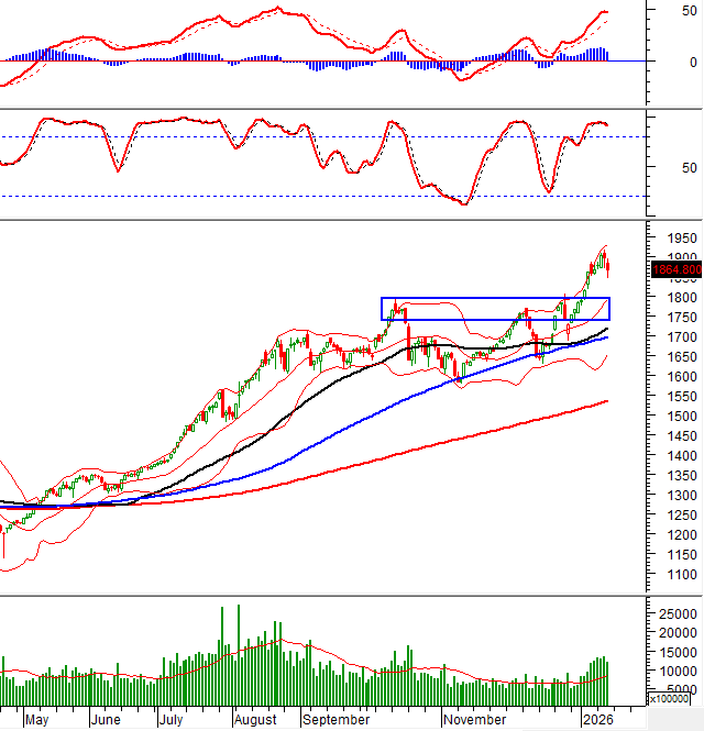 VN-Index tiếp tục điều chỉnh với khối lượng giao dịch duy trì trên mức trung bình 20 ngày cho thấy áp lực chốt lời mạnh đang hiện diện. Rủi ro ngắn hạn có dấu hiệu gia tăng khi chỉ báo Stochastic Oscillator tiếp tục suy yếu sau khi cho tín hiệu bán, đồng thời MACD cũng bắt đầu chững lại đà tăng. Trong bối cảnh đó, đỉnh cũ đã bị vượt qua của tháng 10/2025 sẽ đóng vai trò hỗ trợ quan trọng trong ngắn hạn.
