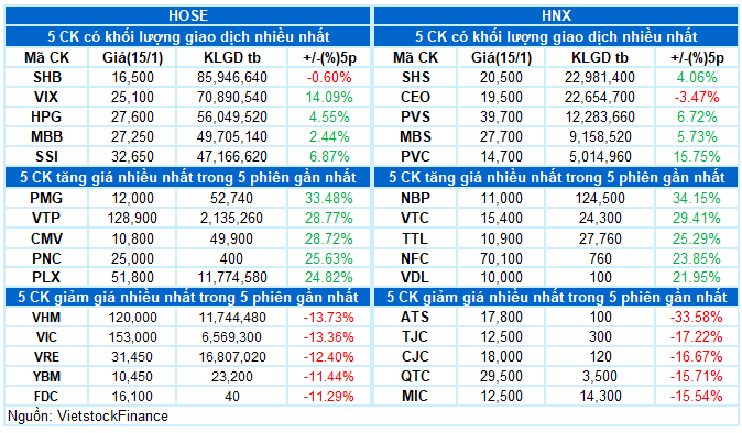– Các chỉ số chính giảm điểm trong phiên giao dịch ngày 15/01. VN-Index giảm mạnh 1.56%, xuống còn 1,864.8 điểm. HNX-Index dừng sát mốc tham chiếu, đóng cửa tại 253.16 điểm.