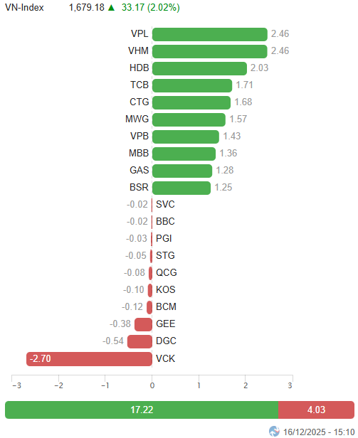 – Phiên giao dịch sáng ngày 16/12 diễn ra khá ảm đạm khi VN-Index vẫn chịu áp lực đáng kể từ nhóm cổ phiếu vốn hóa lớn, khiến chỉ số lùi về giao dịch quanh ngưỡng 1,630 điểm. Tuy nhiên, bức tranh thị trường đã thay đổi hoàn toàn khi bước sang phiên chiều. Lực cầu bắt đáy bất ngờ được kích hoạt mạnh mẽ và nhanh chóng lan tỏa ở khắp các nhóm ngành. Tâm lý nhà đầu tư chuyển biến tích cực rõ rệt khi dòng tiền tham gia ngày càng chủ động hơn. Kết phiên, VN-Index đóng cửa tại 1,679.18 điểm, tăng 2.02% so với phiên trước.