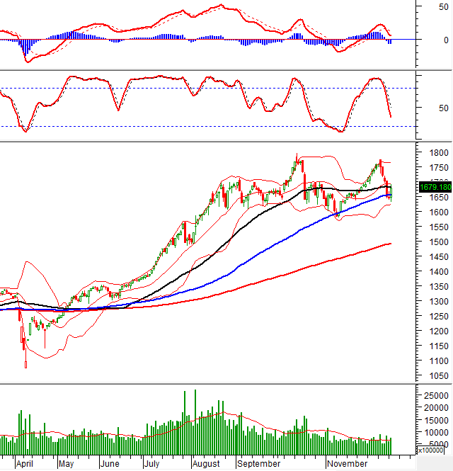 VN-Index đảo chiều mạnh mẽ trong phiên chiều và vượt trở lại đường SMA 100 ngày. Tuy nhiên, các chỉ báo Stochastic Oscillator và MACD vẫn đi xuống trong bối cảnh chỉ số đang nằm dưới đường Middle của Bollinger Bands, cho thấy thị trường có thể còn xuất hiện những biến động bất ngờ trong các phiên tới.