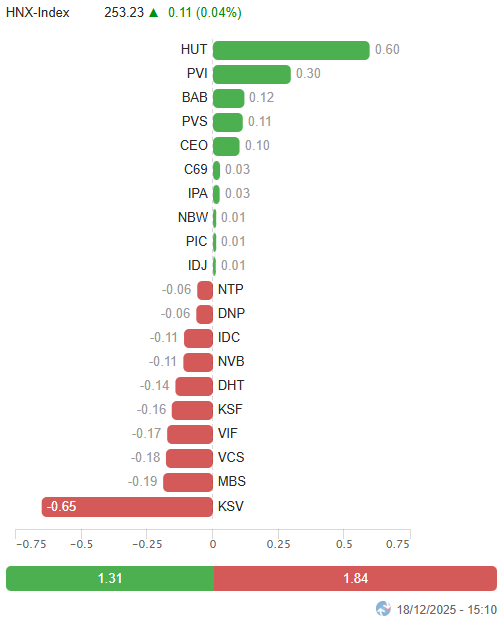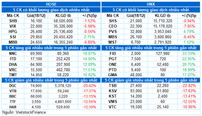 – Các chỉ số chính đóng cửa với sắc xanh nhẹ trong phiên giao dịch ngày 18/12. Cụ thể, VN-Index tăng nhẹ 0.2%, lên mức 1,676.98 điểm; HNX-Index dừng ngay trên mốc tham chiếu, đạt 253.23 điểm.