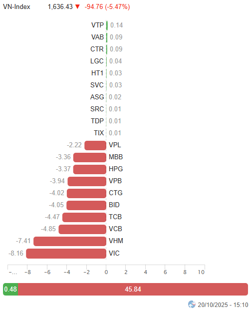 – Thị trường chứng khoán Việt Nam mở đầu tuần mới bằng một phiên lao dốc kinh hoàng. VN-Index chìm trong sắc đỏ từ những phút giao dịch đầu tiên với áp lực lớn từ nhóm cổ phiếu bất động sản. Những nỗ lực phục hồi riêng lẻ không đủ mạnh khi các cổ phiếu trụ ngày càng trượt dốc, khiến chỉ số mất hơn 20 điểm vào cuối phiên sáng. Mọi thứ còn tệ hơn nhiều trong phiên chiều khi chỉ số đánh mất ngưỡng hỗ trợ quan trọng 1,700 điểm và rơi thẳng đứng trong làn sóng bán tháo ồ ạt. Lực cầu gần như tê liệt trong khi số lượng cổ phiếu giảm sàn tăng vọt, phản ánh rõ tâm lý hoảng loạn bao trùm toàn thị trường. Kết phiên, VN-Index “bốc hơi” tới gần 95 điểm (-5.47%), dừng tại 1,636.43 điểm, đánh dấu phiên giảm sâu nhất kể từ sau cú sốc thuế quan hồi tháng 04/2025.