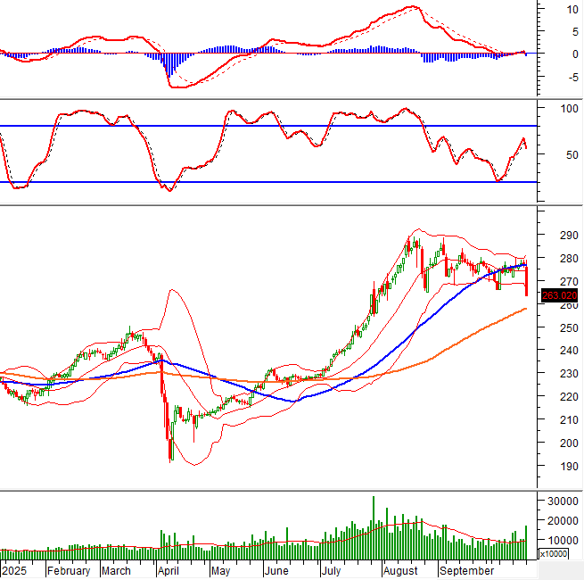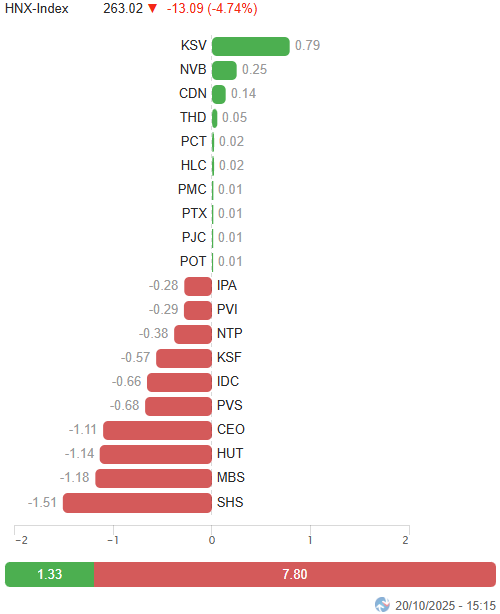HNX-Index lao dốc và phá vỡ đáy cũ tháng 08/2025 (tương đương vùng 265-270 điểm). Ngưỡng này sẽ chuyển từ hỗ trợ thành kháng cự trong thời gian tới.