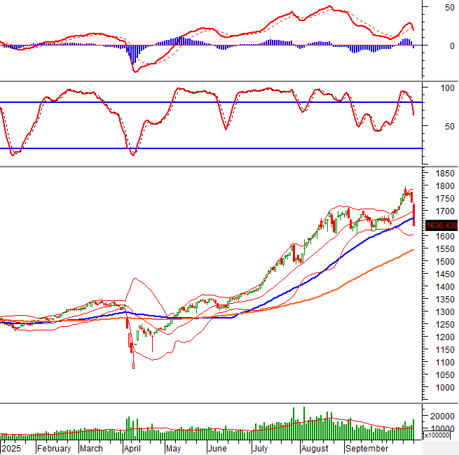 Chỉ số xuyên thủng mốc 1,700 điểm, cắt xuống đường Middle của Bollinger Bands và chuẩn bị test lại đáy cũ tháng 08/2025 (tương đương 1,605-1,630 điểm).