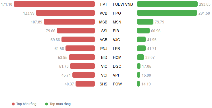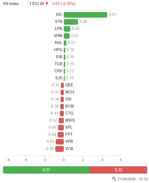– Về mức độ ảnh hưởng, VIC vẫn giữ vai trò nâng đỡ chính với đóng góp 4.5 điểm, cùng STB, LPB và VHM hỗ trợ thêm tổng cộng gần 3 điểm tăng cho VN-Index. Tuy nhiên, áp lực bán gia tăng trên diện rộng về cuối phiên đã khiến chỉ số không thể giữ được sắc xanh, với VCB, VPB, FPT và VPL là những mã gây sức ép nhiều nhất.