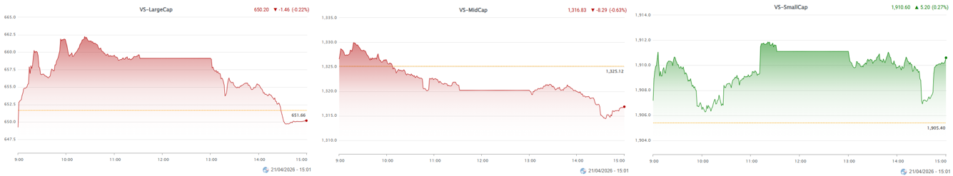 – Xét theo nhóm vốn hóa, áp lực điều chỉnh trở nên rõ nét khi VS-LargeCap quay đầu giảm 0.22% và VS-MidCap cũng giảm 0.63%. Trong khi đó, VS-SmallCap diễn biến tích cực hơn với mức tăng nhẹ 0.27%.