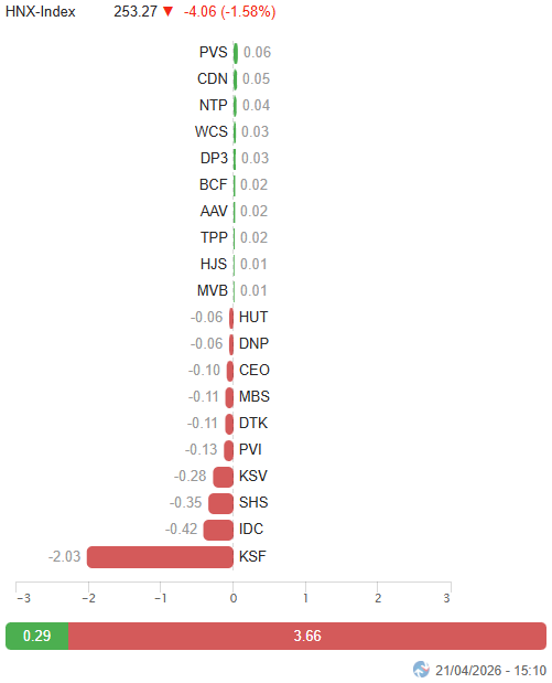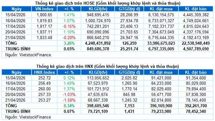 – Các chỉ số chính đồng loạt giảm điểm trong phiên giao dịch ngày 21/04. VN-Index giảm 0.2%, dừng tại 1,833.48 điểm. HNX-Index lùi về 253.27 điểm, giảm 1.58%.