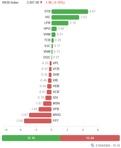 – VN30-Index giảm nhẹ 1.96 điểm (-0.1%), dừng tại 2,007.08 điểm. Độ rộng rổ nghiêng về bên bán với 21 mã giảm và 9 mã tăng. FPT và SSI là hai mã điều chỉnh mạnh nhất khi lần lượt mất 2.3% và 2.2%, cùng với loạt cổ phiếu giảm trên 1.5% như VPL, MWG, VPB và VIB. Ở chiều ngược lại, STB dẫn đầu với mức tăng nổi bật 5.5%, cùng LPB và VIC tăng trên 1%.