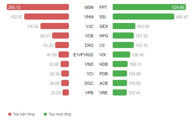– Về mức độ ảnh hưởng, VIC là đầu tàu dẫn dắt khi đem về 7.6 điểm cho VN-Index. Bên cạnh đó, VHM và FPT cũng góp thêm tổng cộng hơn 5 điểm tăng. Ngược lại, MSN, GAS và NVL là những cái tên gây áp lực đáng kể ở phía ngược lại, lấy đi hơn 2 điểm của chỉ số chung.