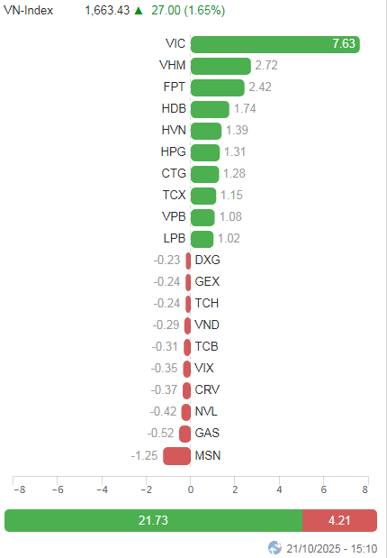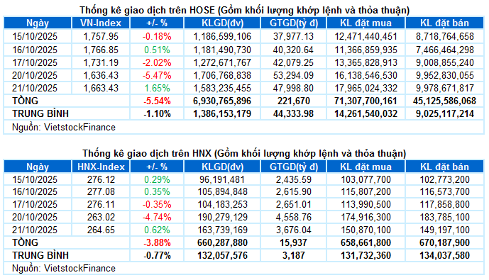 – Thị trường hồi phục trong phiên 21/10 sau cú rơi bất ngờ hôm trước. VN-Index mở cửa khá tích cực trong bối cảnh nhóm cổ phiếu trụ lấy lại sắc xanh trên diện rộng, giúp tâm lý nhà đầu tư phần nào ổn định trở lại. Tuy nhiên, sự phân hóa vẫn diễn ra rõ nét khi dòng tiền tỏ ra thận trọng. Lực bán ra để tranh thủ cơ cấu danh mục trong nhịp hồi khiến chỉ số suy yếu về cuối phiên sáng. Dù vậy, việc khối ngoại đảo chiều mua ròng mạnh là điểm sáng đáng chú ý. Sang phiên chiều, chỉ số dần quay lại đà tăng với độ rộng thị trường được cải thiện đáng kể. VN-Index kết phiên với mức phục hồi 27 điểm (+1.65%), lên mức 1,663.43 điểm.