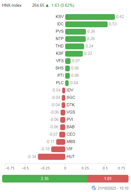 – Các chỉ số chính đồng loạt phục hồi trong phiên giao dịch ngày 21/10. Cụ thể, VN-Index tăng 1.65%, lên mức 1,663.43 điểm; HNX-Index cũng tăng 0.62%, đạt 264.65 điểm.