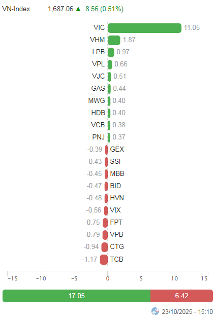 – Trong phiên giao dịch ngày 23/10/2025, thị trường mở cửa khá thận trọng khi lực cầu chưa thực sự lan tỏa khiến VN-Index dao động quanh mốc tham chiếu trong phần lớn buổi sáng. Tuy nhiên, từ cuối phiên sáng, dòng tiền quay trở lại mạnh mẽ ở các nhóm vốn hóa lớn đã giúp chỉ số bật và giữ vững sắc xanh trong phần lớn thời gian còn lại. Dù áp lực chốt lời xuất hiện nhẹ về cuối phiên, VN-Index vẫn giữ vững đà tăng và đóng cửa tại 1,687.06 điểm, tăng gần 9 điểm so với phiên trước.