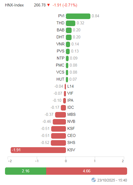 – Các chỉ số chính tăng giảm trái chiều trong phiên giao dịch ngày 23/10. Cụ thể, VN-Index tăng 0.51%, lên mức 1,687.06 điểm; trong khi đó, HNX-Index giảm 0.71%, xuống còn 266.78 điểm.