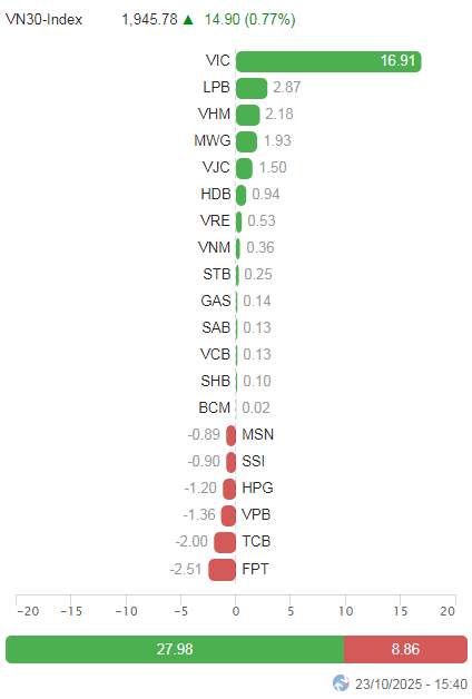 VN30-Index kết phiên tăng gần 15 điểm, lên mức 1,945.78 điểm. Độ rộng của rổ cân bằng với 14 mã tăng, 14 mã giảm và 2 mã đứng giá. Ở chiều tăng điểm, VIC là điểm sáng nổi bật nhất với mức tăng vượt trội 5.9%. Tiếp đến là các mã LPBVJC cũng đồng loạt tăng hơn 2%. Còn ở chiều ngược lại, SSI, FPTTCB đội sổ với mức điều chỉnh trên 2%.