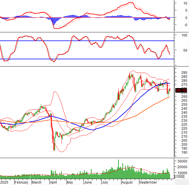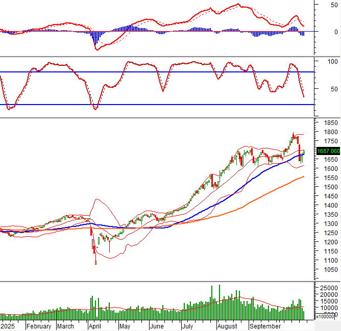 VN-Index hồi phục phiên thứ 3 liên tiếp nhưng chưa thể vượt lên đường Middle của Bollinger Bands. Đây sẽ là bài test quan trọng trong ngắn hạn của chỉ số. Khối lượng giao dịch tiếp tục giảm và thấp hơn mức trung bình 20 phiên, cho thấy tâm lý nhà đầu tư vẫn còn thận trọng trong nhịp hồi phục hiện tại.