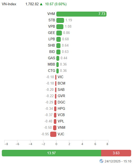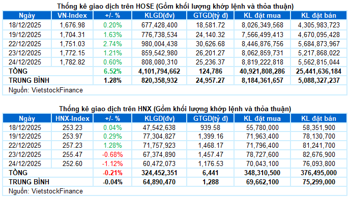 – Thị trường bước vào ngày giao dịch 24/12 với những nhịp rung lắc mạnh ngay từ đầu phiên, sau đó chuyển sang trạng thái giằng co quanh mốc tham chiếu đến hết phiên sáng. Sự phân hóa diễn ra rõ nét trên diện rộng cho thấy dòng tiền vẫn vận động theo hướng chọn lọc. Áp lực bán gia tăng đáng kể trong nửa đầu phiên chiều nhưng lực kéo kịp thời từ nhóm cổ phiếu vốn hóa lớn đã giúp chỉ số trở lại mạnh mẽ hơn. Bên cạnh đó, lực mua ròng tích cực từ khối ngoại cũng là điểm tựa góp phần giúp VN-Index giữ vững chuỗi tăng điểm. Kết phiên, VN-Index dừng tại 1,782.82 điểm, tăng 0.6% so với phiên trước.
