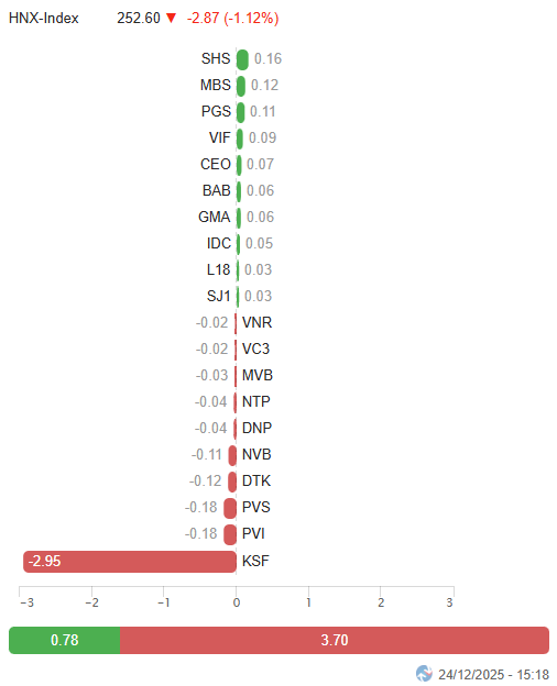 – Các chỉ số chính ghi nhận diễn biến trái chiều trong phiên giao dịch ngày 24/12. VN-Index tăng 0.6%, lên mức 1,782.82 điểm. Trong khi đó, HNX-Index giảm 1.12%, xuống còn 252.6 điểm.