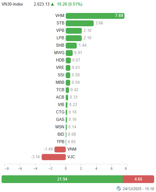 VN30-Index tăng hơn 10 điểm (+0.51%), đóng cửa tại 2,023.13 điểm. Độ rộng nghiêng về bên mua với 18 mã tăng, 11 mã giảm và 1 mã đứng giá. Trong đó, VHM bứt phá ấn tượng nhất khi tiến sát mức giá trần, theo sau là STB, SHB, LPBVPB cũng đồng loạt tăng hơn 2%. Trái lại, DGCVJC chịu áp lực bán mạnh với mức giảm lần lượt 5.2% và 3.6%.