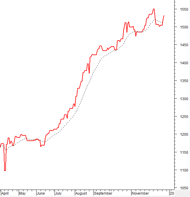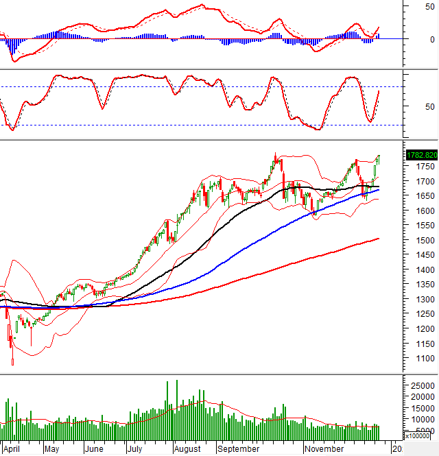 VN-Index tăng điểm sau diễn biến giằng co mạnh trong phiên, qua đó nối dài chuỗi tăng lên phiên thứ 5 liên tiếp. Chỉ số tiếp tục bám sát Upper Band của Bollinger Bands kèm theo khối lượng giao dịch duy trì trên mức trung bình 20 ngày. Tín hiệu mua ròng tích cực của khối ngoại trong các phiên gần đây sẽ củng cố thêm cho triển vọng tích cực trong ngắn hạn.
