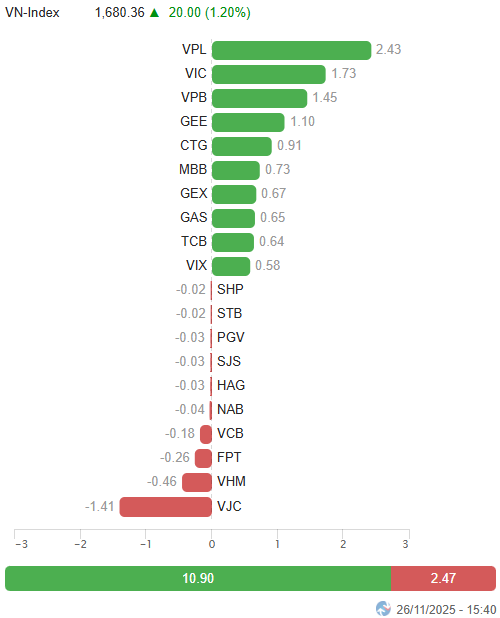 – Thị trường ghi nhận nhịp phục hồi trên diện rộng trong phiên 26/11. VN-Index khởi đầu đầy hứng khởi khi sắc xanh lan tỏa ở nhiều nhóm ngành, nhanh chóng kéo chỉ số lên giao dịch quanh ngưỡng 1,675 điểm. Dù diễn biến rung lắc của một vài trụ lớn khiến đà tăng bị chững lại trong cuối phiên sáng, nhưng lực cầu nhìn chung vẫn duy trì ổn định. Bước sang phiên chiều, sự đồng thuận hơn từ nhóm vốn hóa lớn giúp đà tăng trở lại mạnh mẽ. VN-Index tăng tốc dứt khoát và đóng cửa với 20 điểm tăng so với phiên trước, đạt 1,680.36 điểm.