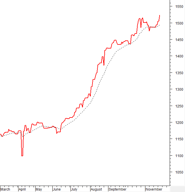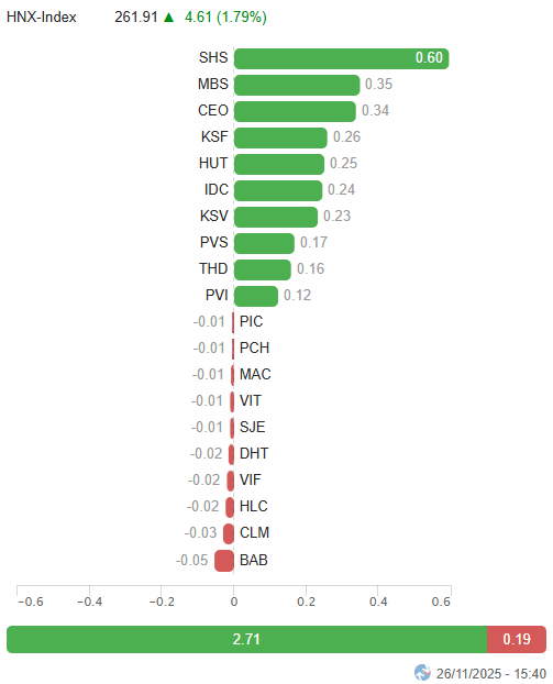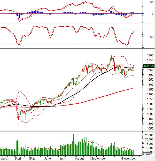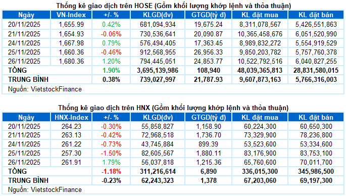 – Các chỉ số chính đồng loạt bứt phá trong phiên giao dịch ngày 26/11. VN-Index tăng 1.2%, lên mức 1,680.36 điểm; HNX-Index tăng mạnh 1.79%, đạt 261.91 điểm.