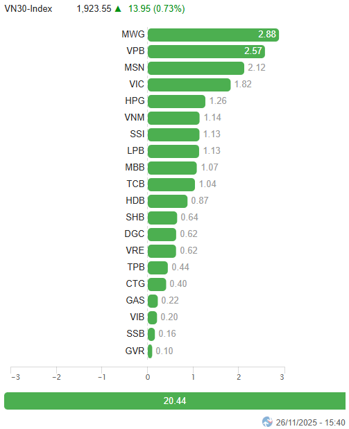 – VN30-Index tăng 13.95 điểm (+0.73%), lên mức 1,923.55 điểm. Phe mua chiếm ưu thế áp đảo với 24 mã tăng, 5 mã giảm và 1 mã đứng giá. Trong đó, SSI nổi bật nhất với mức tăng vượt trội 3.5%. Theo sau là VPB, TPB, MWG và MSN cũng đều bứt phá hơn 2%. Ngược lại, VJC chịu áp lực chốt lời lớn sau chuỗi 4 phiên tăng mạnh trước đó, xếp cuối bảng với mức giảm 5.2%.