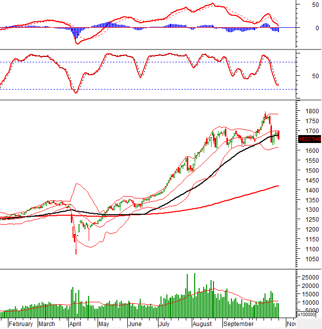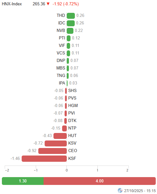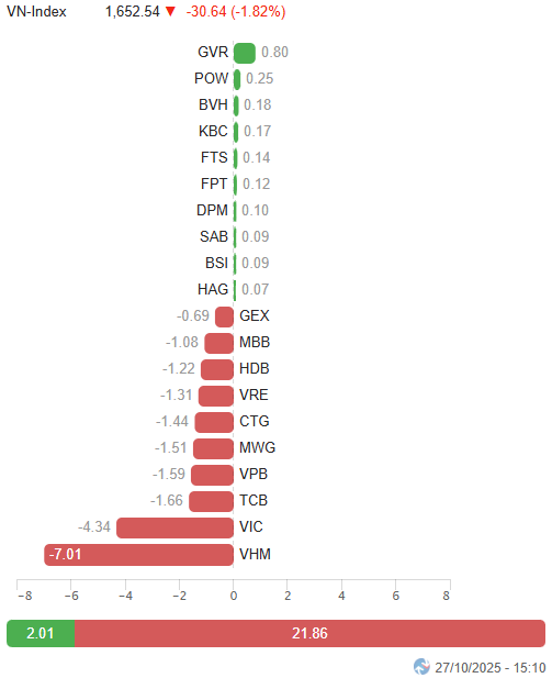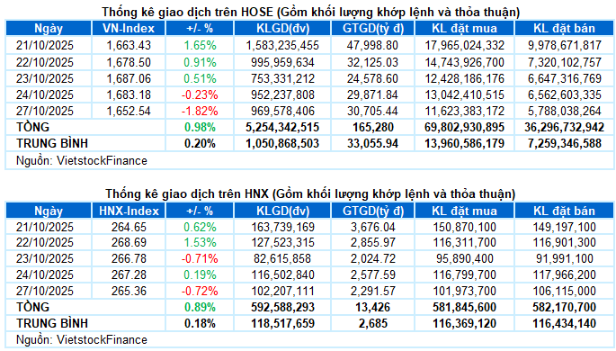 – Phiên giao dịch ngày 27/10 khởi đầu khá tích cực khi VN-Index tiến sát mốc 1,700 điểm ngay từ khi mở cửa, nhưng lực bán chốt lời xuất hiện sớm đã khiến chỉ số nhanh chóng đảo chiều. Dù nỗ lực phục hồi xuất hiện quanh vùng 1,665 điểm nhưng dòng tiền vẫn tỏ ra thận trọng rõ rệt, khiến thị trường rơi vào thế giằng co kéo dài. Tình hình càng trở nên tồi tệ hơn trong những phút cuối phiên khi áp lực bán dâng cao ở nhóm cổ phiếu trụ, kéo theo tâm lý tiêu cực bao trùm toàn thị trường. VN-Index kết phiên tại mức 1,652.54 điểm, giảm 1.82% so với phiên trước.