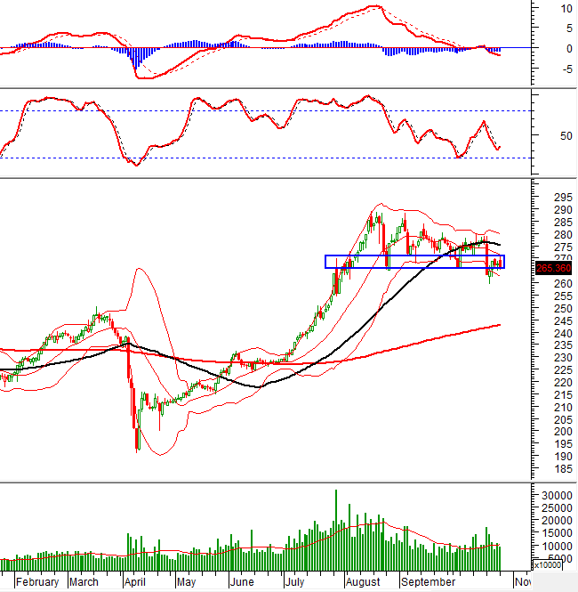HNX-Index tiếp tục giằng co ở vùng đáy cũ tháng 08/2025 (tương đương vùng 265-270 điểm). Những phiên tăng giảm đan xen kèm khối lượng giao dịch trồi sụt gần đây thể hiện tâm lý thiếu ổn định của nhà đầu tư.